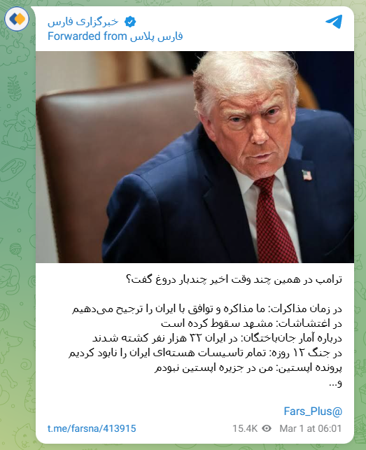 特朗普发帖后不久,伊朗法尔斯通讯社在社交媒体“Telegram”上发文,并“援引知情人士的消息”称,特朗普的说法“毫无根据”。不过,这一帖文并未具体说明针对的是特朗普的哪一项言论,帖文中仅包含了一张特朗普的照片。