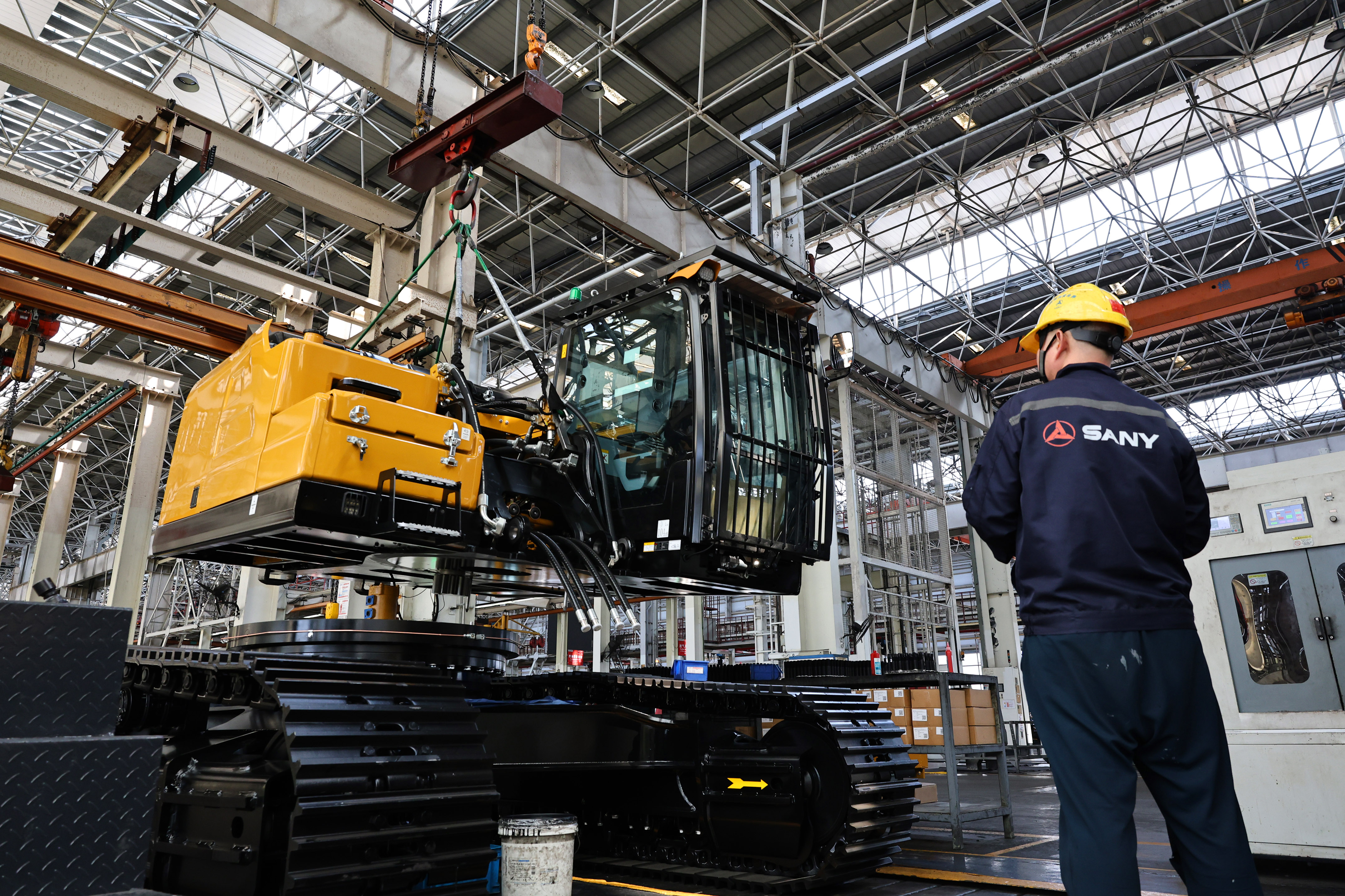 工人在上海三一重机股份有限公司产线上工作(4月15日摄)。新华社记者 方喆 摄